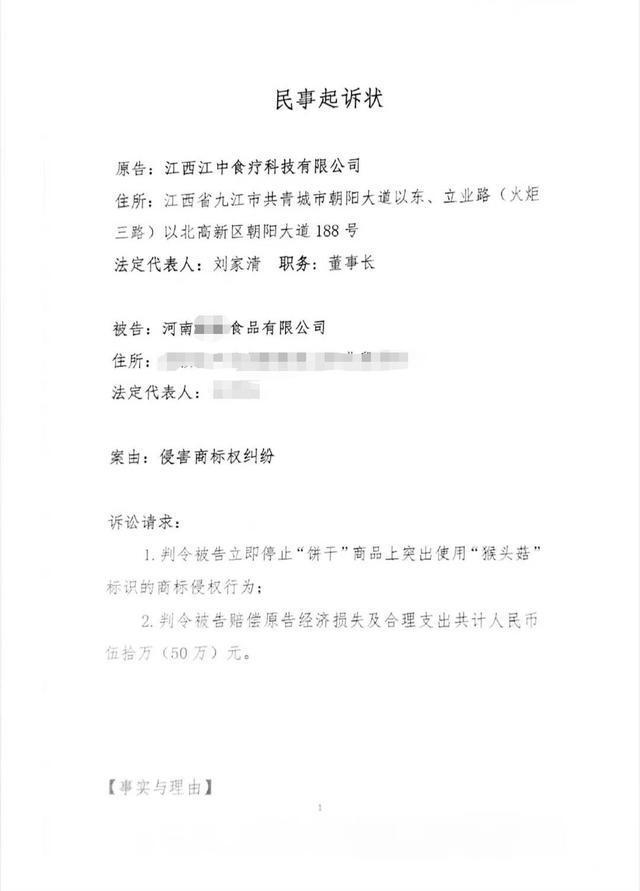 卢先生提供的《民事起诉状》显示,原告江西江中食疗科技有限公司以“侵害商标权纠纷”为案由,起诉河南某峰食品有限公司,诉讼请求被告立即停止饼干商品上突出“猴头菇”标识的商标侵权行为;判令被告赔偿原告经济损失及合理支出50万元。起诉状落款时间为6月2日。