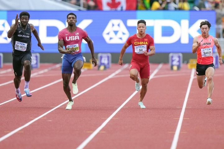 7月16日,苏炳添(右二)在2022世界田径锦标赛男子100米半决赛中。新华社记者王迎摄