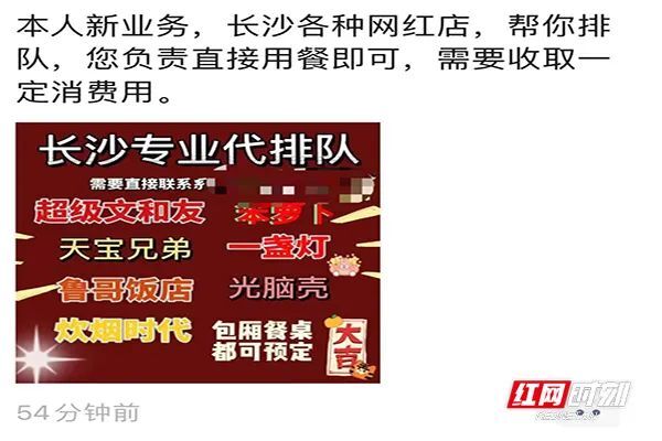 “长沙壹盏灯、笨罗卜、天宝兄弟、超级文和友、鲁哥饭店、金色印象、茶颜悦色等各种网红店专业代排队,只需告诉我几个人、几点、在哪个饭店用餐,然后您直接在那个时间点来用餐即可,为您节省宝贵的时间,开心游玩。”近日,随着炎炎夏日的到来,作为网红城市的长沙迎来了大批游客,在小红书、微信朋友圈等社交平台也出现了此类“代排”业务。