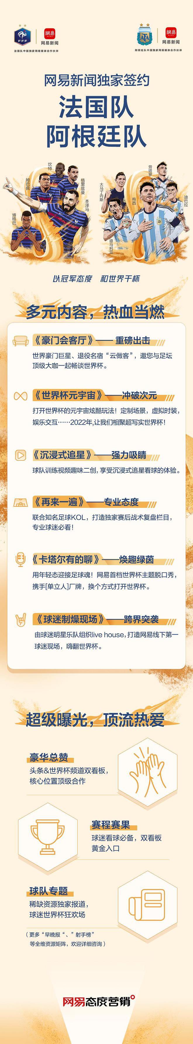 2022年卡塔尔世界杯进入开幕倒计时。7月14日、15日,网易传媒相继宣布与顶级夺冠热门球队法国队、阿根廷队签约,成为两支队伍的中国独家网络媒体合作伙伴,在独家资讯、球星互动、集体肖像权等方面达成深度合作。同时,网易传媒还发布了本次世界杯报道slogan——“以冠军态度和世界干杯”,将围绕世界杯赛事和签约球队推出一系列精彩策划,为广大用户献上足球内容盛宴。