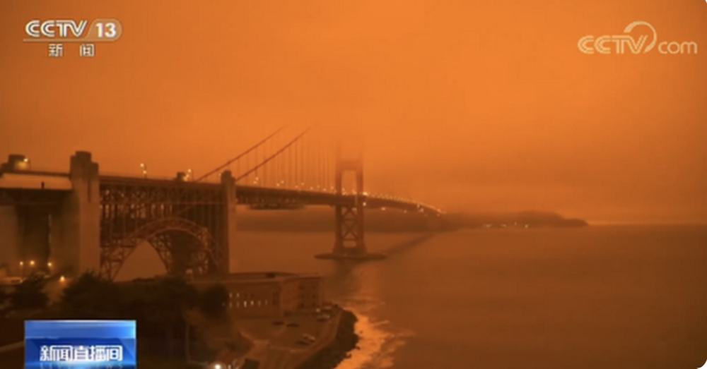 2020年9月,旧金山的天空曾变成橙色,引发人们不安。当地空气质量官员解释称,这是因为在强风和高温下,山火席卷美国多地,空气中的山火烟雾粒子散射出蓝光,只允许黄-橙-红光到达地面,才导致天空看起来是橙色的。