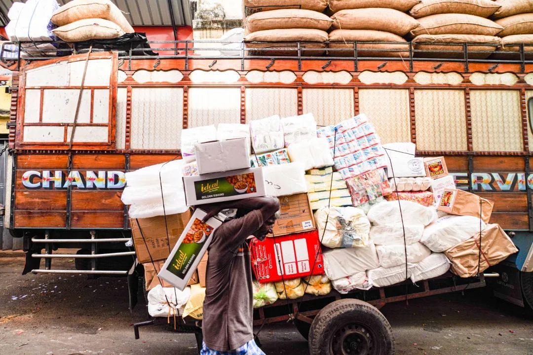 一名男子在斯里兰卡科伦坡贝塔市场搬运货物。唐璐摄(新华社)