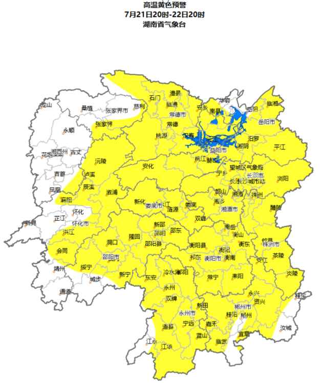 湖南省气象台07月21日16时发布高温黄色预警:预计21日20时至22日20时,长沙、株洲、湘潭、衡阳、邵阳、岳阳、常德、张家界南部、益阳、郴州、永州、怀化东部、娄底将达到35℃以上高温,局部地区将达37℃以上,请做好防范。