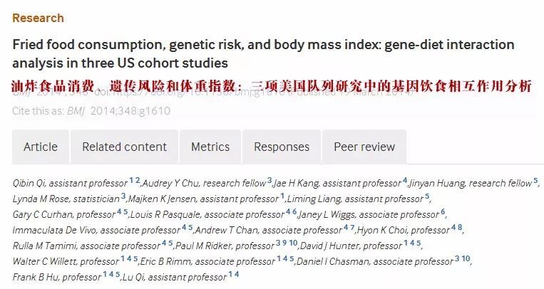 2014年一项来自哈佛公共卫生学院的研究,纳入了来自两个队列研究的9623名女性和6379名男性参与者,并在21421名女性中进行重复验证,发现:油炸食品摄入与肥胖相关的遗传易感性间存在交互作用。