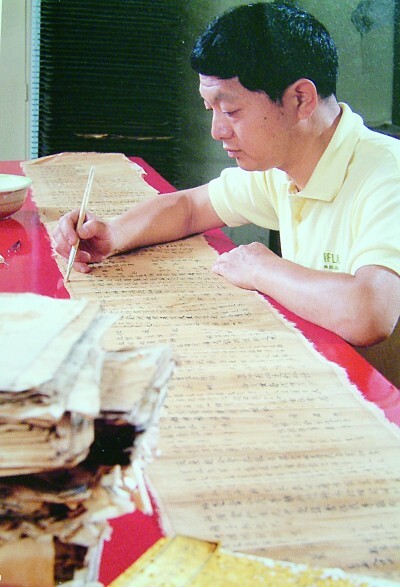 国家图书馆研究馆员、国家级非物质文化遗产代表性项目传承人杜伟生在修复敦煌遗书。受访者供图