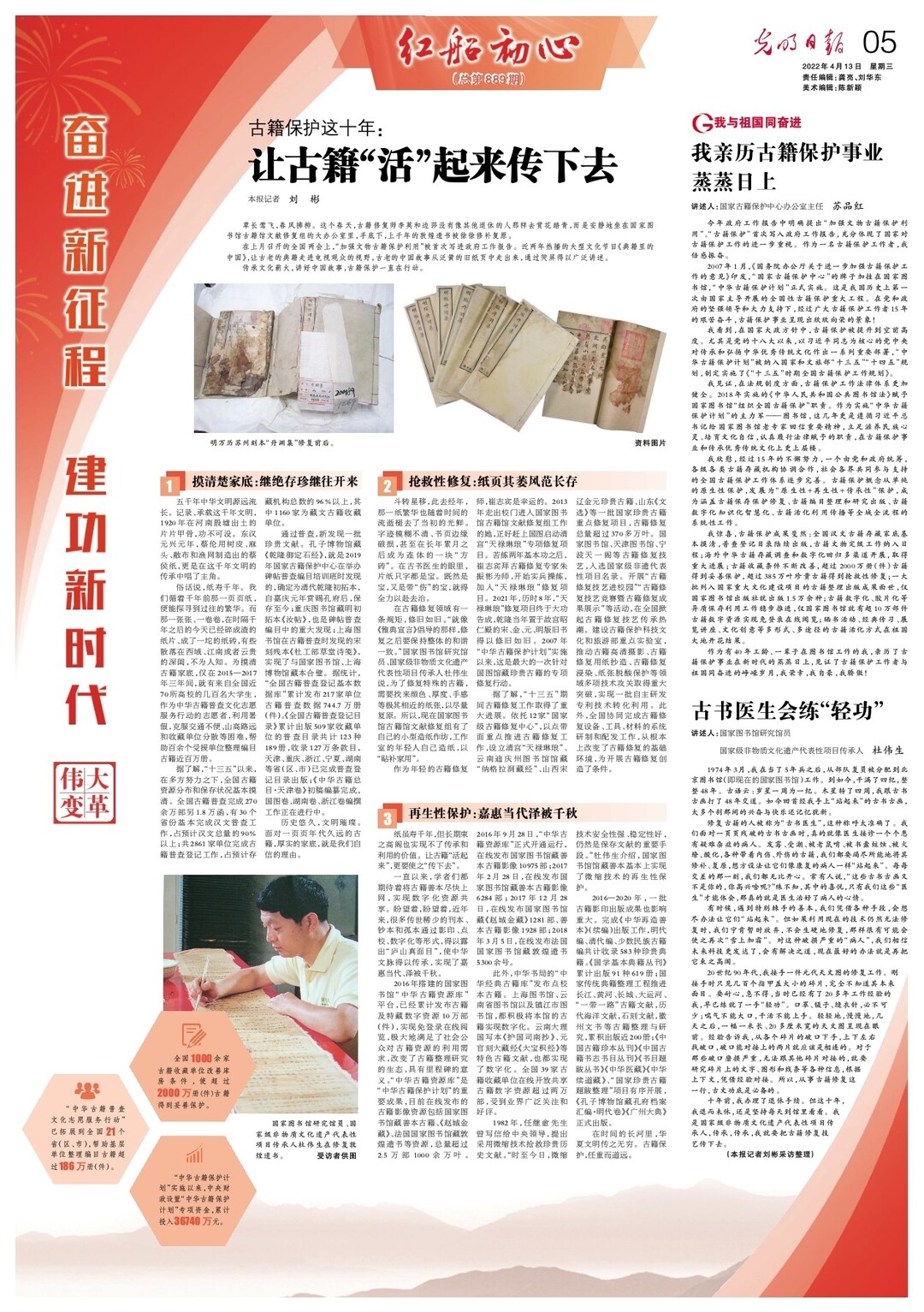 据了解,“十三五”期间古籍修复工作取得了重大进展。依托12家“国家级古籍修复中心”,以点带面重点推进古籍修复工作,设立清宫“天禄琳琅”、云南迪庆州图书馆馆藏“纳格拉洞藏经”、山西宋辽金元珍贵古籍、山东《文选》等一批国家珍贵古籍重点修复项目,古籍修复总量超过370多万叶。国家图书馆、天津图书馆、宁波天一阁等古籍修复技艺,入选国家级非遗代表性项目名录。开展“古籍修复技艺进校园”“古籍修复技艺竞赛暨古籍修复成果展示”等活动,在全国掀起古籍修复技艺传承热潮。建设古籍保护科技文化和旅游部重点实验室,推动古籍高清摄影、古籍修复用纸抄造、古籍修复浸染、纸张脱酸保护等领域多项技术攻关取得重大突破,实现一批自主研发专利技术转化利用。此外,全国协同完成古籍修复设备、工具、材料的系统研制和配发工作,从根本上改变了古籍修复的基础环境,为开展古籍修复创造了条件。