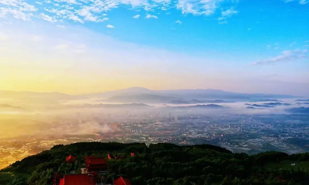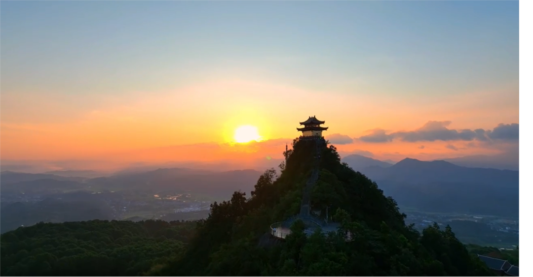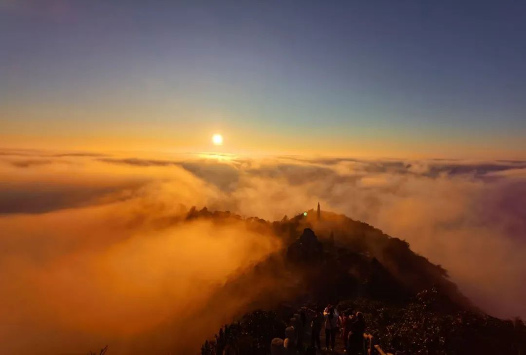 从飞山金鼎向东方望去,随着太阳慢慢升起,天空的云朵被染成了金色,气势磅礴。太阳与寺庙相互呼应,当其与寺庙重合时,恰似佛光照耀,摄人心魄。