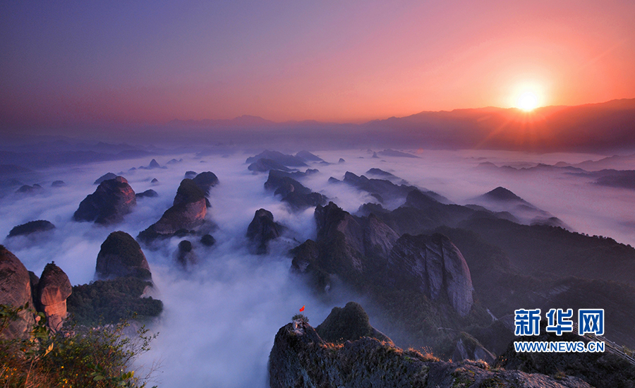 登上八角寨山,置身于翻滚的云气里观看日出。峰峦如聚,旭日与云海交相辉映,山川如一幅水墨画,红日点缀其上,壮丽风光让人心潮澎湃。