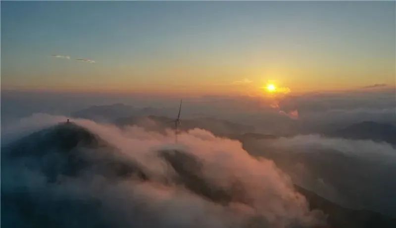 晨曦中太阳缓缓升起,将云海映照得绚烂多彩、如梦似幻,青翠的山岭之间,云海依着山势如潮水般涌动,波澜壮阔。