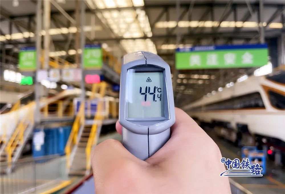 为保证动车组空调制冷功能正常,他们每天都要用点温仪测试空调出风口温度,确认空气滤网更换和冷凝器冲洗情况,保证空调温度保持在26摄氏度左右。