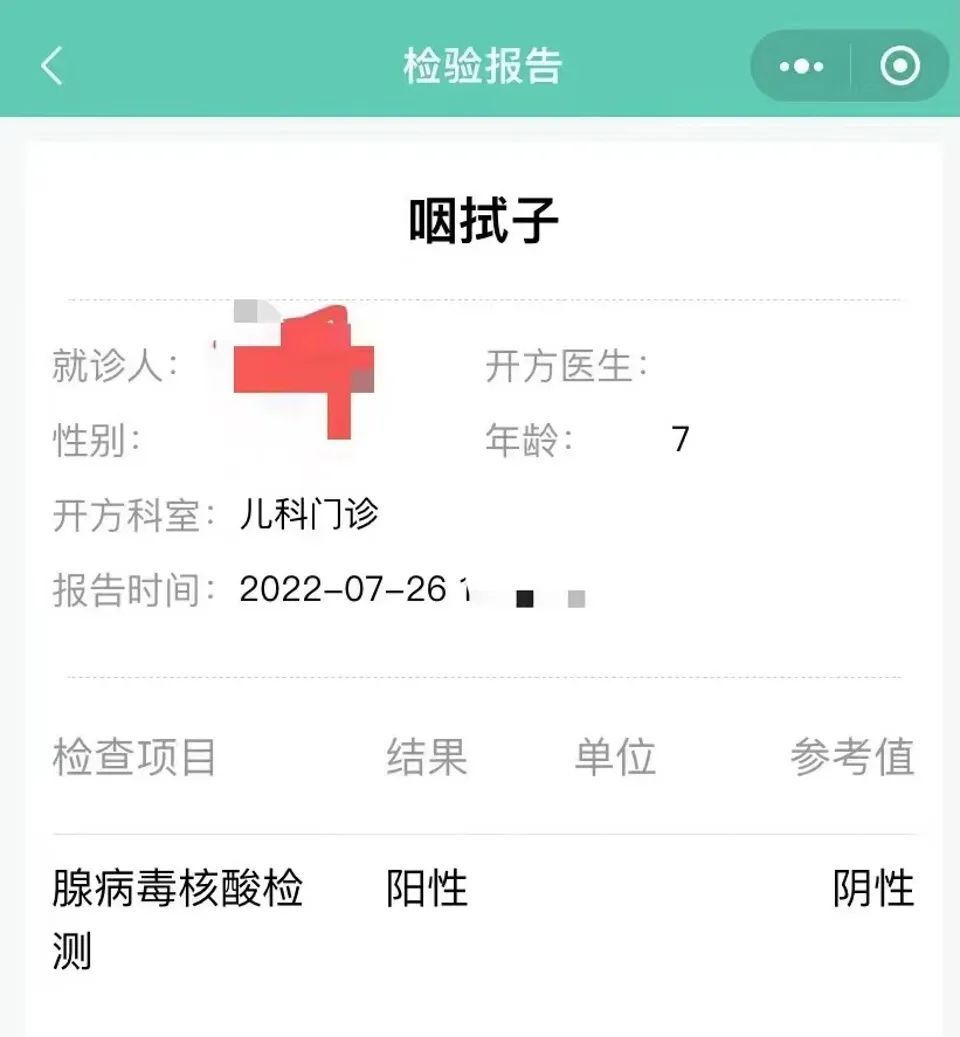 同一时间,多位家长自行送发热患儿到乐山检测腺病毒。19名家长向南方周末记者表示,自己孩子得到了阳性检测结果。其中10人出示了孩子咽拭子核酸检测阳性的报告截图。