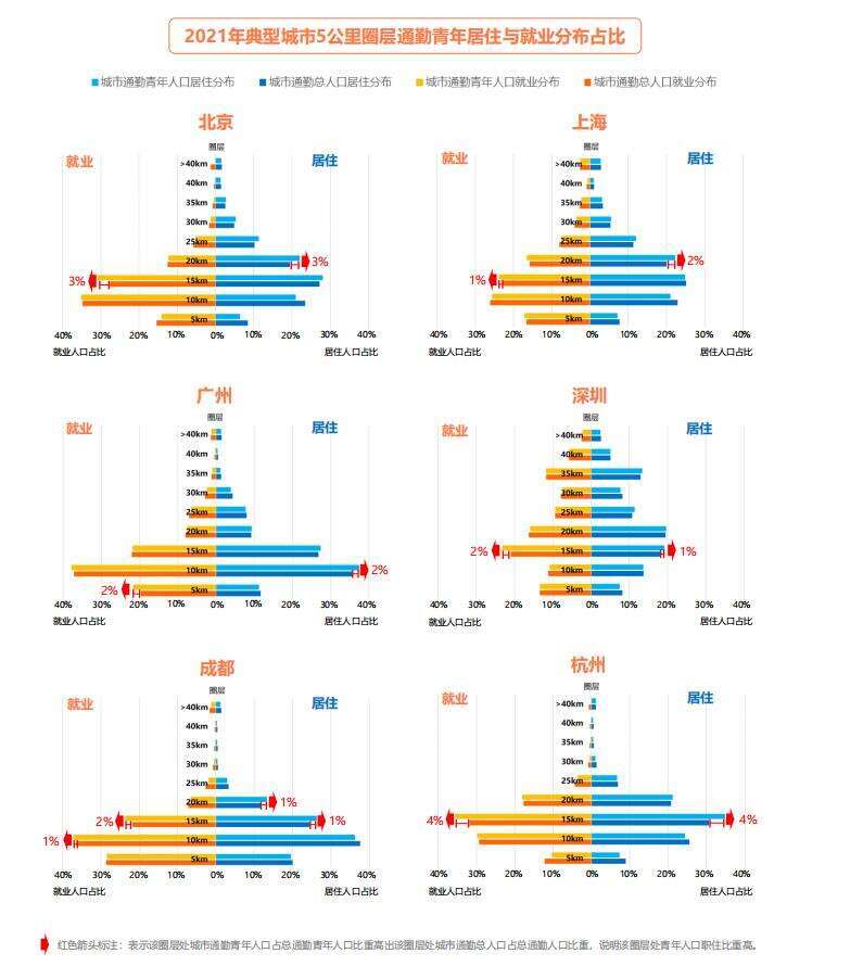 报告显示,在北、上、广、深、成、杭6个受到青年关注的城市,近80%的青年就业集中在15公里以内的城市就业中心,但受到居住成本与社区环境影响,65%的青年人群居住在城市中心15公里以外。