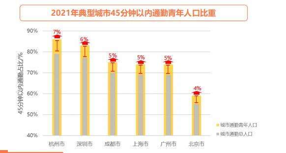 根据报告,在上述6个城市中,近80%青年45分钟以内通勤可达。即便是全国通勤时耗最长、极端通勤占比最大(30%)的北京,也有近60%的青年45分钟通勤可达,高于城市平均水平4个百分点。