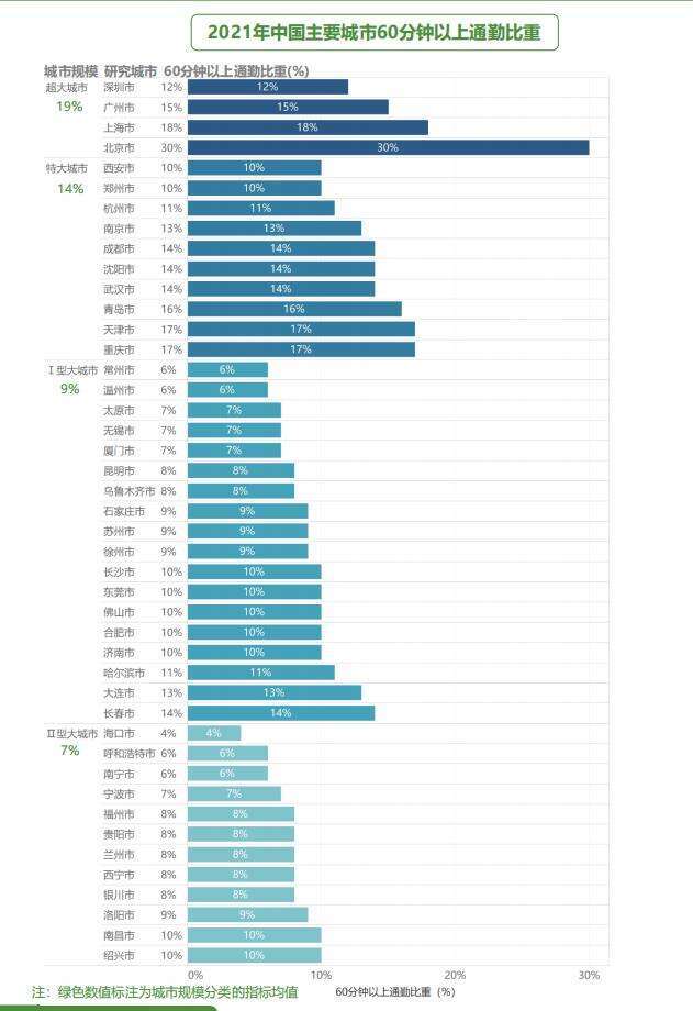 深圳保持城市通勤的“优等生”,极端通勤比例仅12%,低于城市规模更小的特大城市平均水平;上海通勤稳步改善,2020年上海极端通勤人口减量最大,减少超150万人,2019~2021年,上海单程平均通勤时耗从42分钟减少到40分钟。