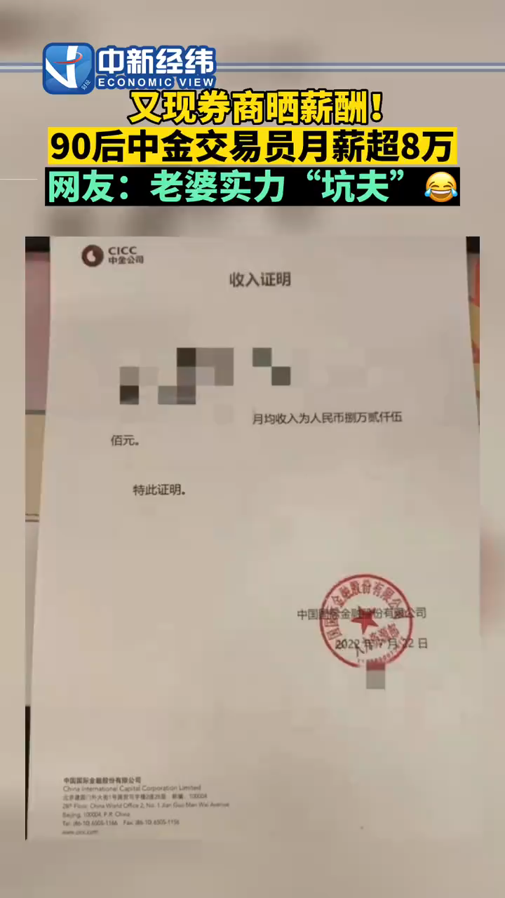 7月28日,券商员工薪酬水平再次登上热搜,引发广泛关注。网传中金公司一名交易员的配偶晒出了其丈夫的收入证明,印有中金公司公章的证明材料显示,该交易员的月均收入为8.25万元。图片配文称:“93年老公的收入水平,所以算婚后财产吗?”