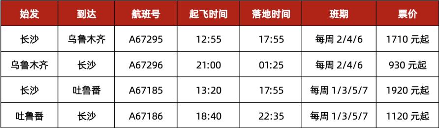 湖南航空全面优化航线网络布局,已加密长沙至乌鲁木齐、长沙至吐鲁番航线。其中,长沙至乌鲁木齐航班,班期为每周二、周四、周六;长沙至吐鲁番航班,班期为每周一、周三、周五、周日。7月底,湖南航空将新增无锡至吐鲁番航线,届时将拥有3条直飞新疆航线。