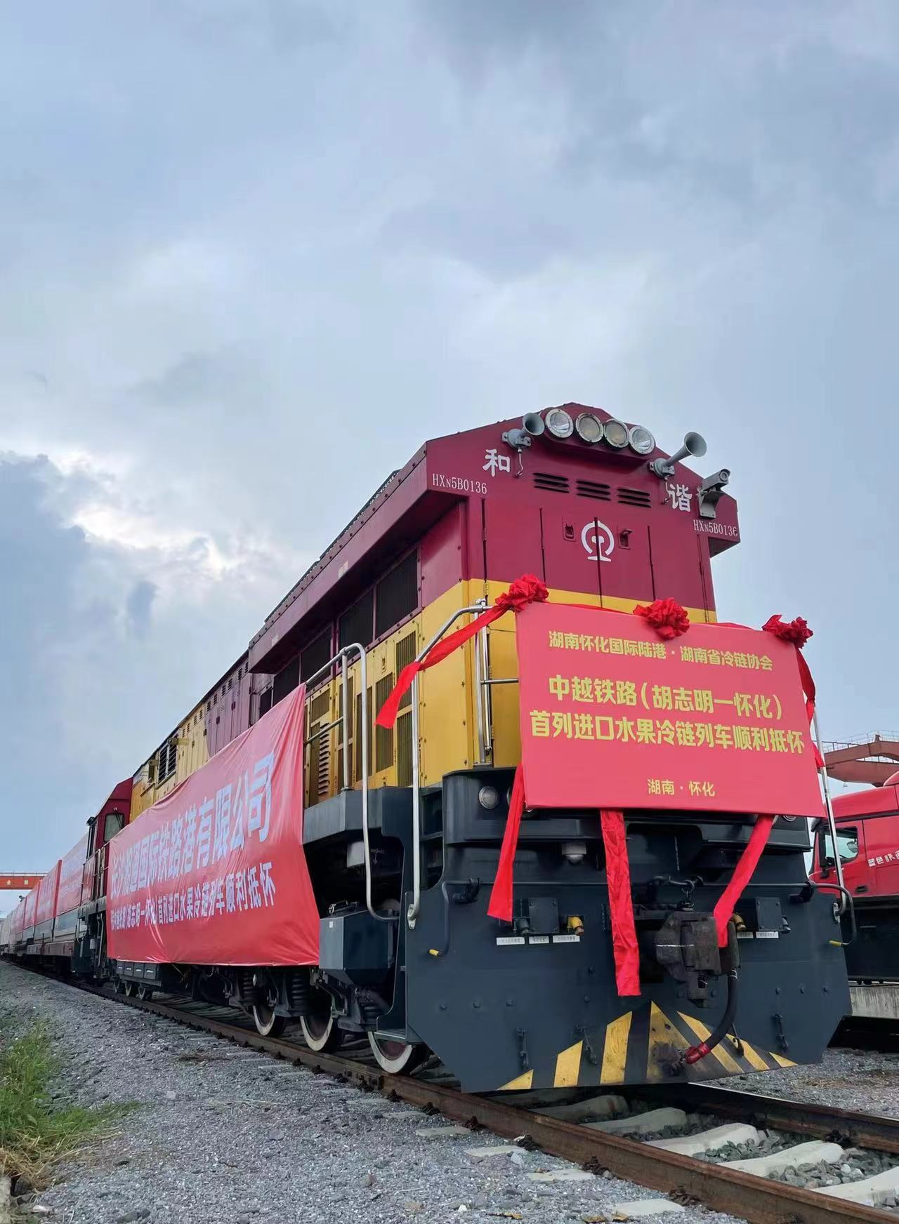 湖南日报7月7日讯(全媒体记者 彭可心 通讯员 黎磊 梁晶进)今天上午10时许,随着一声汽笛长鸣,28002次中越铁路国际冷链测试班列顺利抵达怀化西物流园。这是越南首次开行通达湖南地区国际冷链班列,也是我国铁路开行的首趟全程铁路运输国际冷链班列。标志着怀化成为我国中部地区首个实现冷链国际班列开行的城市。