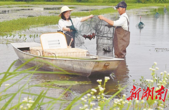 6月23日,南县浪拔湖镇稻虾生态种养示范基地,湖南日报全媒体记者杨玉菡(左)与养殖户在收获小龙虾。 湖南日报全媒体记者 徐行 摄