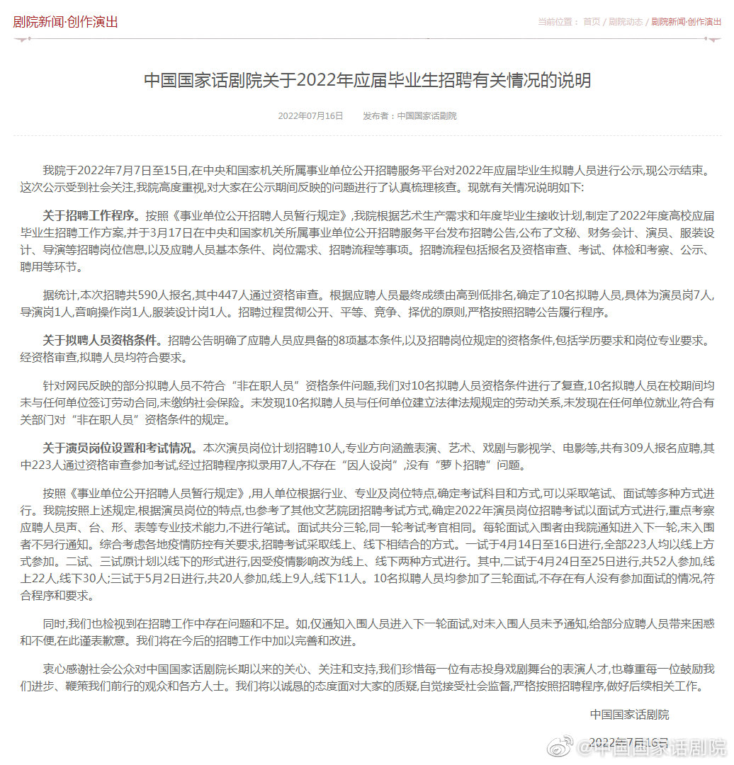 衷心感谢社会公众对中国国家话剧院长期以来的关心、关注和支持,我们珍惜每一位有志投身戏剧舞台的表演人才,也尊重每一位鼓励我们进步、鞭策我们前行的观众和各方人士。我们将以诚恳的态度面对大家的质疑,自觉接受社会监督,严格按照招聘程序,做好后续相关工作。