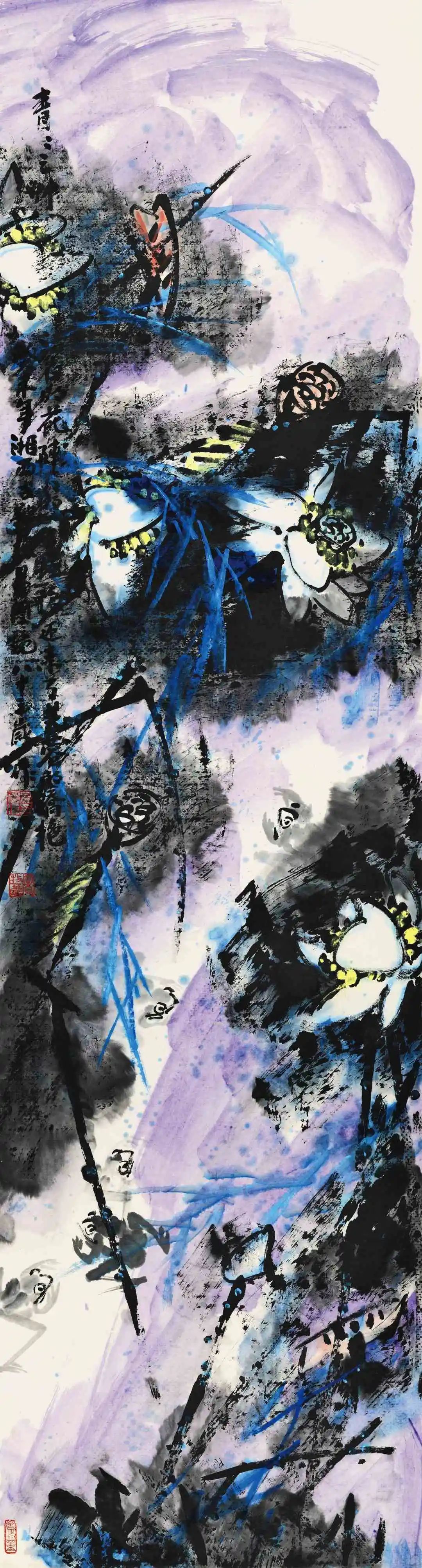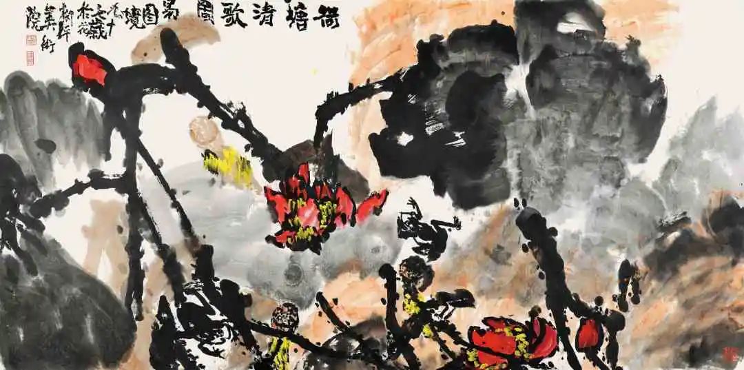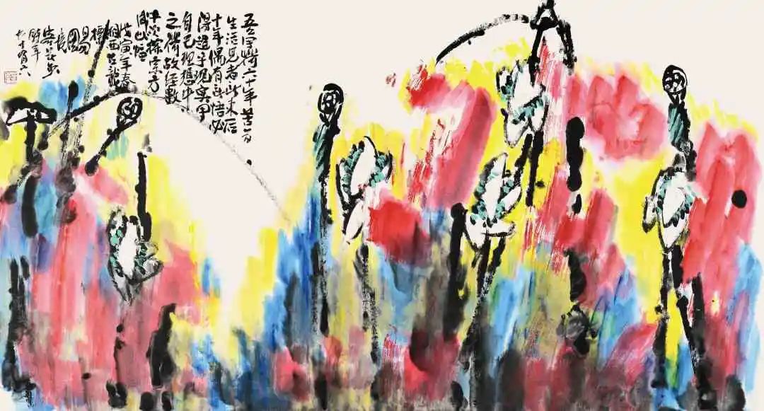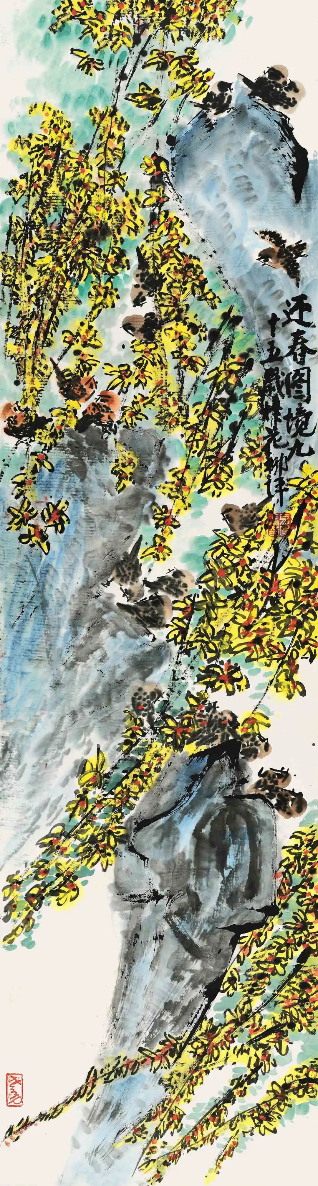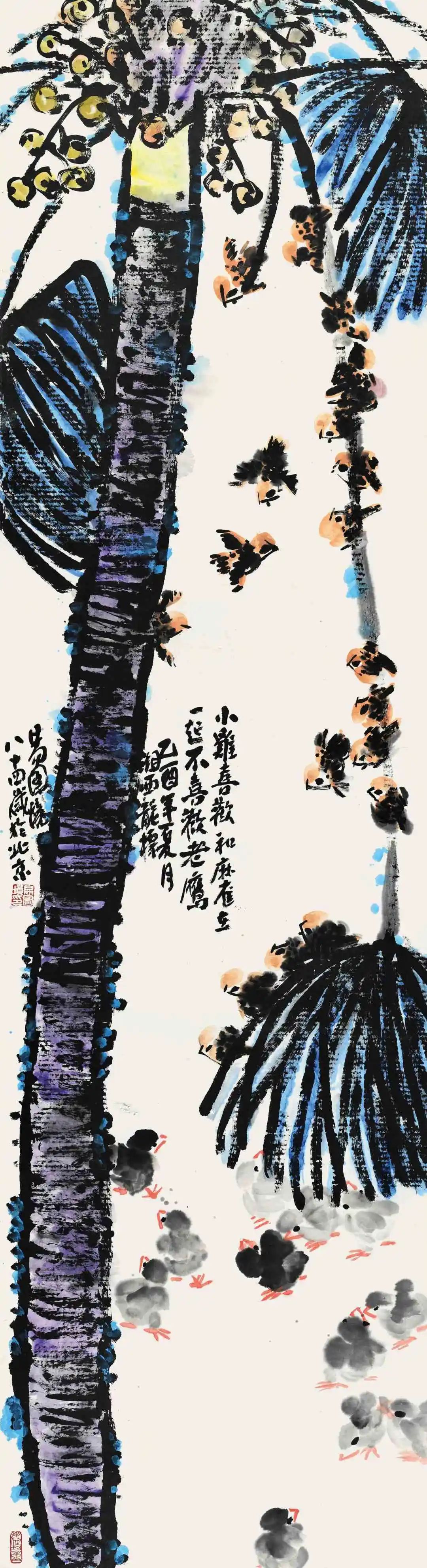 易老从事国画创作与研究八十余年,写意花鸟画笔墨厚重,质朴自然,情趣万千。近二十年的创作中,大胆尝试用丰富的色彩表现对象,成功走出了自己独创的艺术道路,创造了浓墨重彩、浓墨淡彩、焦墨重彩、焦墨淡彩的画风。