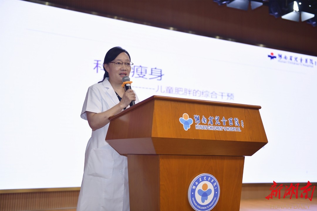 “BMI为全球通用的身体质量指数,其计算方法为体重(公斤)÷ 身高(米)的平方,1-6岁儿童大于20、7-12岁大于21、青春期大于23即为肥胖。”湖南省儿童医院儿童保健所博士生导师钟燕教授、消化营养科主任赵红梅医师、中医科博士副主任医师李海霞在结营仪式现场为孩子及家长进行了科普知识授课,结合中西医特点,为孩子们开出了结营后的“家庭处方”,包括“一对一”瘦身营养食谱与运动计划等。