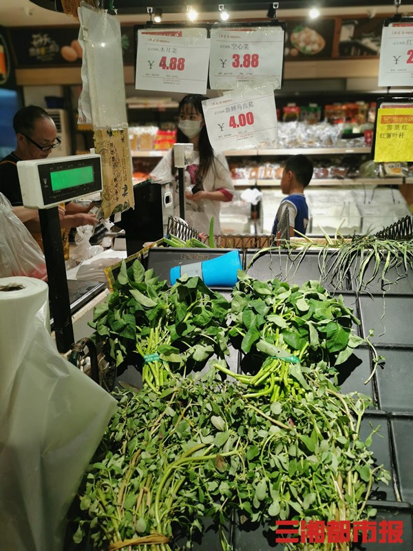 (7月27日下午,湘江世纪城小区旁一家生活超市内,补货后,马齿苋又即将卖光。记者 叶竹 摄 )