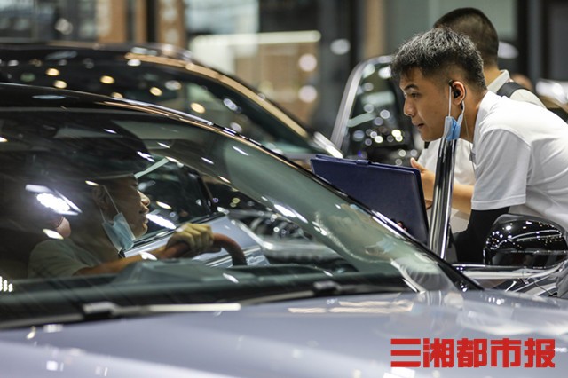 三湘都市报·新湖南客户端7月14日讯(全媒体记者 胡锐 图 刘丰)7月14日,2022湖南车展火热进行中。展馆外,热浪翻滚,展馆内,热情高涨。