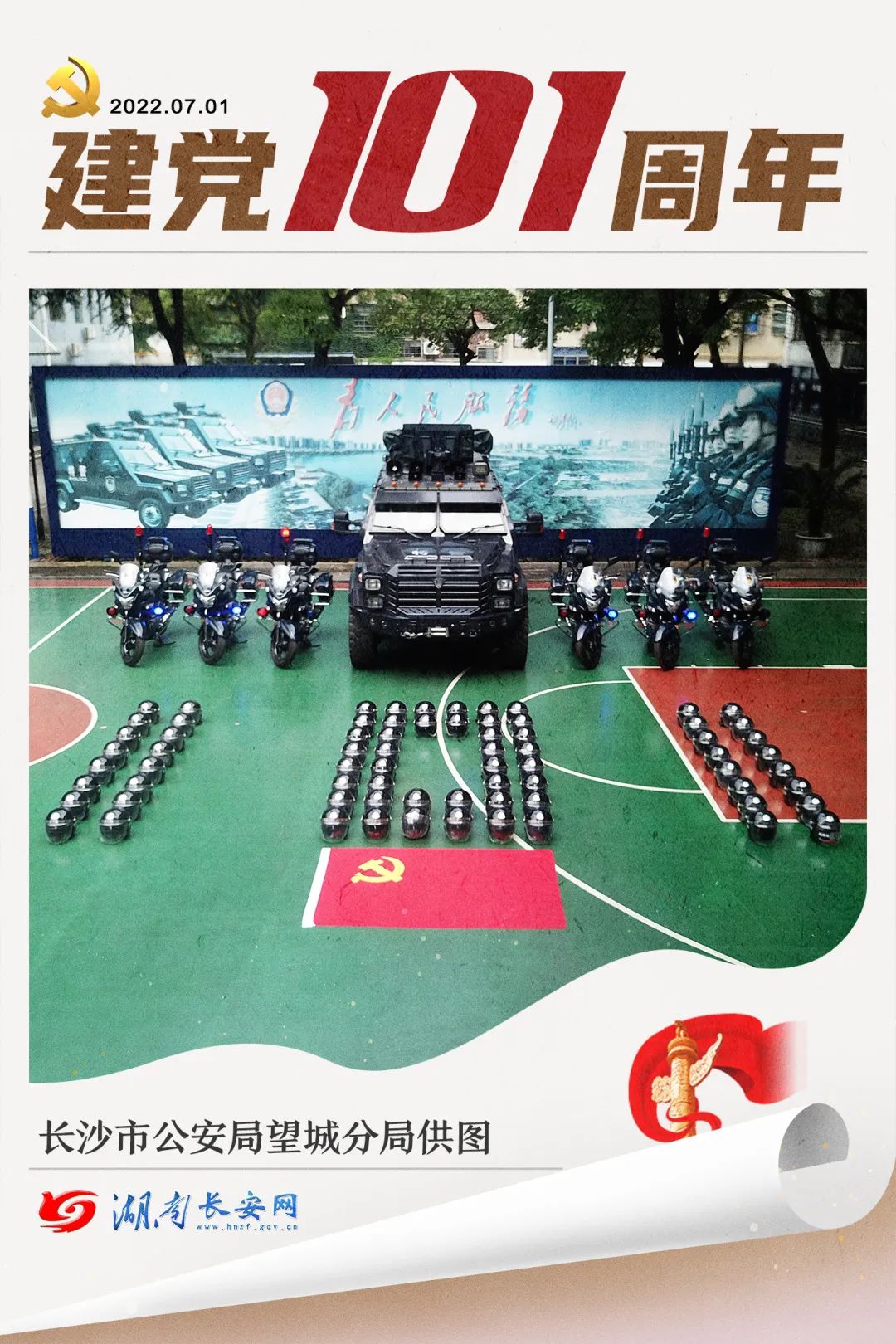 党旗和湖南公安荣誉章组成的“101”。