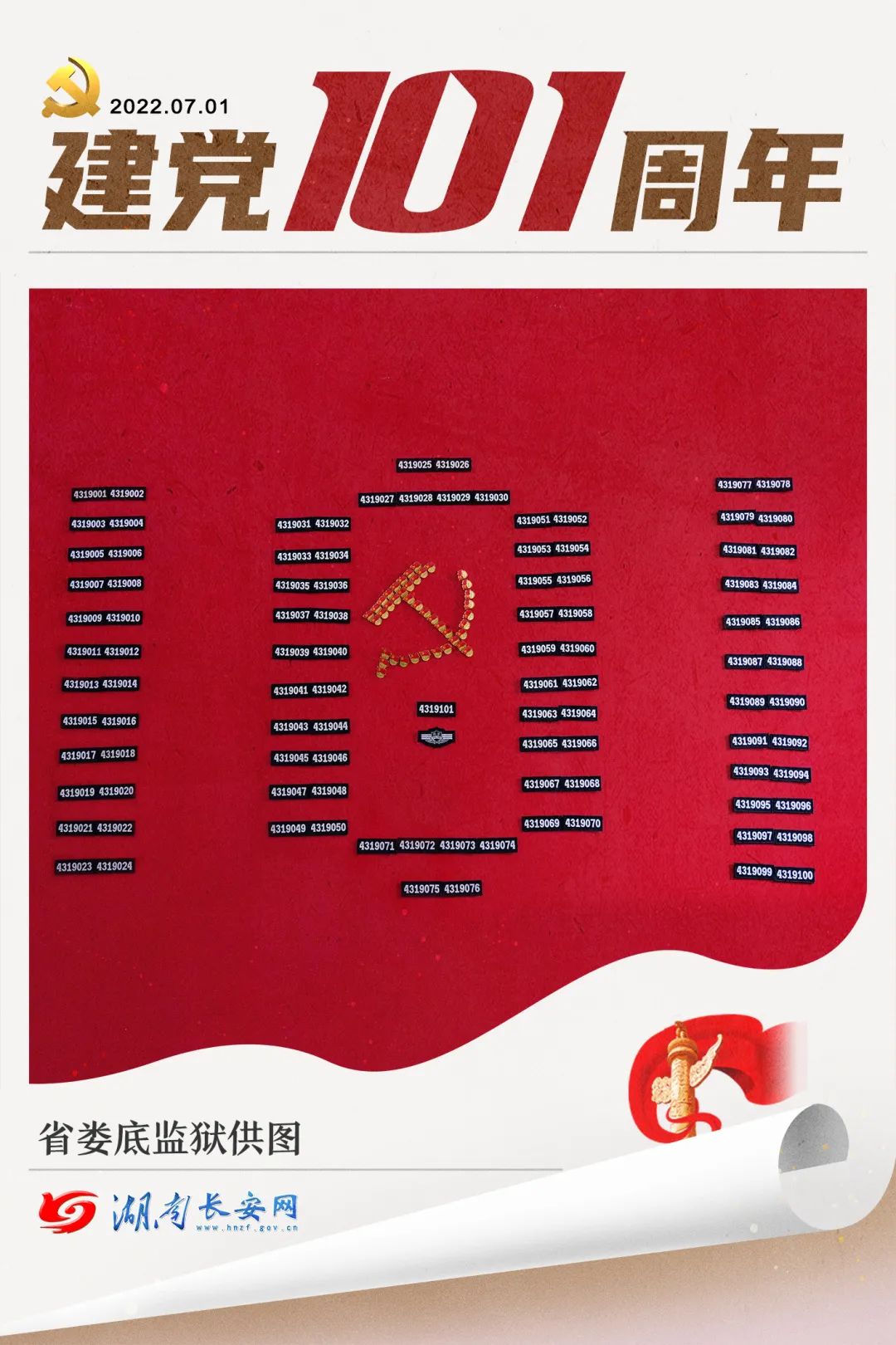 7位数警号是司法行政系统监狱戒毒警察专用警号。它是唯一的,每一个警号代表一名警察;它是神圣的,是每一名警察用忠诚、担当守护的荣耀;它是特别的,是陪伴每一名警察职业生涯的“伙伴”。建党101周年,101名监狱戒毒警察以警号为名,向党献礼。