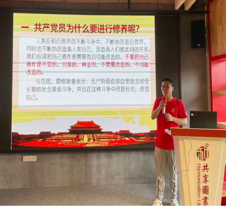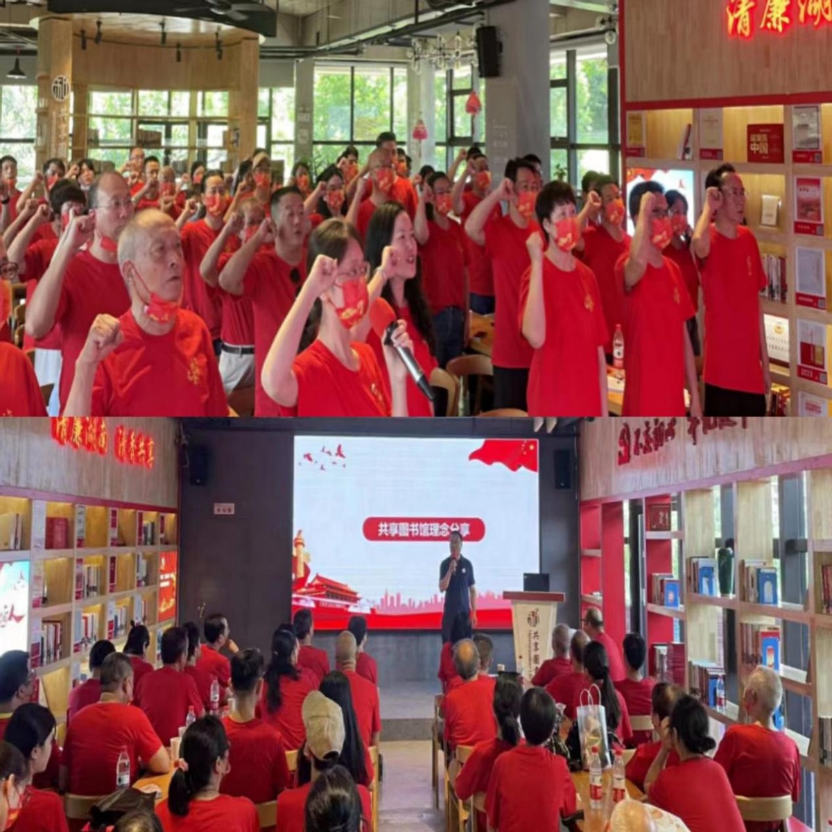 在党员刘璐老师的带领下,全体党员面向党旗,举起右拳,重温入党誓词,表达师生们为党和人民奋斗终身的决心。接下来图书馆主理人黑山老师分享了共享图书馆理念。共享图书馆引入的创新服务模式,提升了综合服务能力,让图书资源流动的理念颇具价值,在图书资源极大丰富、没有市场盈利压力的公共图书馆领域有很强的可操作性。在场的党员都被共享图书馆的“拓荒牛精神”所感动,演讲完毕,会场响起雷鸣般的掌声。