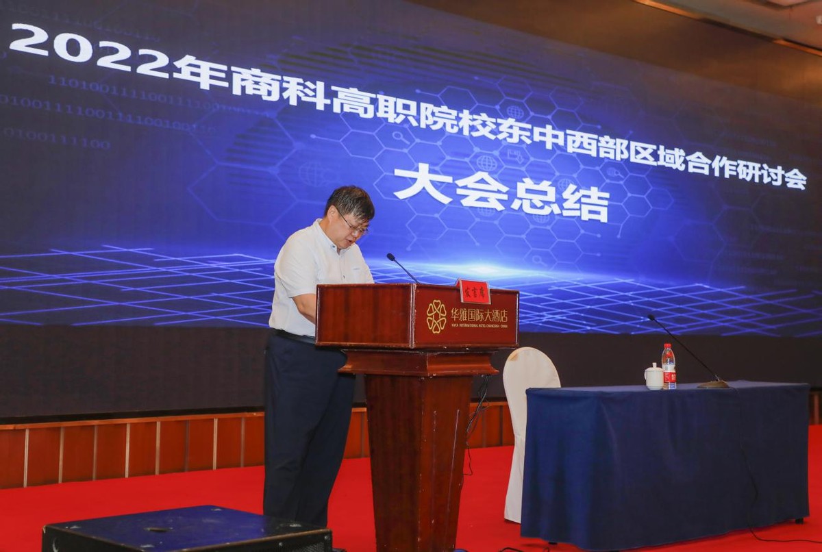 第五阶段由山东商业职业技术学院党委书记张志东进行大会总结。他在总结中指出,这次会议规模大,有来自全国61家院校和企业,共150名嘉宾通过线上线下的方式参会。