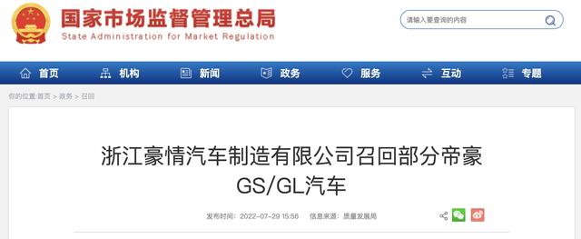 日前,浙江豪情汽车制造有限公司根据《缺陷汽车产品召回管理条例》和《缺陷汽车产品召回管理条例实施办法》的要求,向国家市场监督管理总局备案了召回计划。决定自2022年7月29日起,召回2016年7月1日至2017年6月17日生产的部分帝豪GS/GL汽车,共计28359辆。