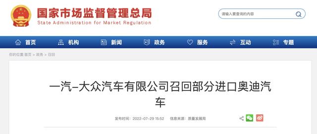 一汽-大众汽车有限公司召回部分进口奥迪汽车