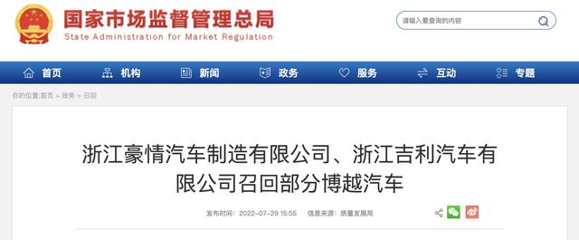 日前,浙江豪情汽车制造有限公司、浙江吉利汽车有限公司根据《缺陷汽车产品召回管理条例》和《缺陷汽车产品召回管理条例实施办法》的要求,向国家市场监督管理总局备案了召回计划。决定自2022年7月29日起,召回2019年12月22日至2021年6月29日期间生产的部分2019年款博越汽车,共计94087辆。