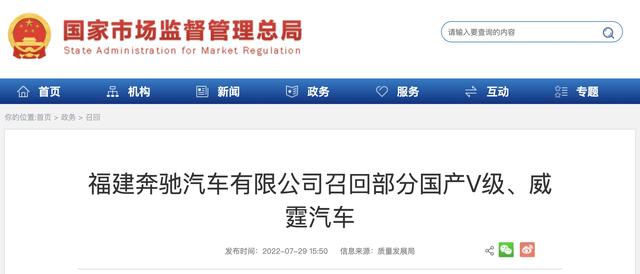 日前,福建奔驰汽车有限公司根据《缺陷汽车产品召回管理条例》和《缺陷汽车产品召回管理条例实施办法》的要求,向国家市场监督管理总局备案了召回计划。自2022年9月5日起,召回生产日期在2021年9月20日至2021年12月6日期间的部分国产V级和威霆汽车,共计158辆。