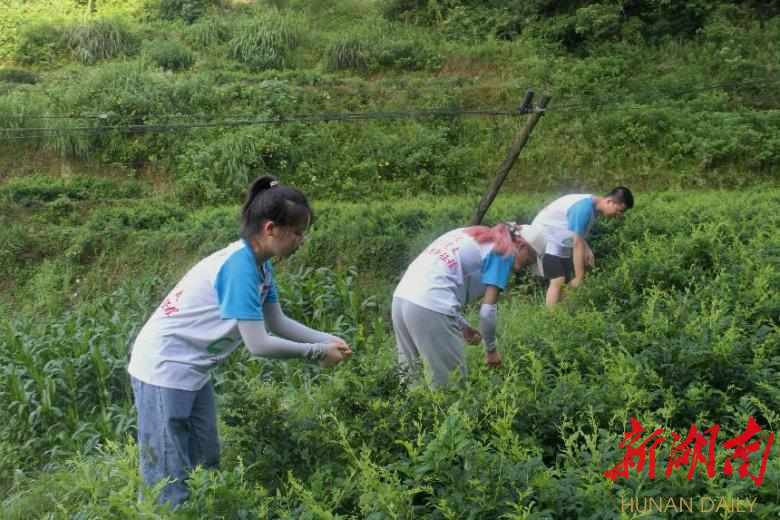 ▲实践队员现场体验莓茶采摘。吴松蔓/摄