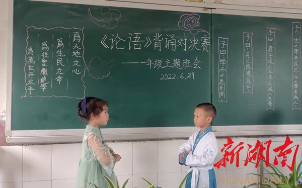 科教新报·新湖南客户端讯(记者 王燕 通讯员 曾霞)“子曰:‘学而时习之,不亦说乎?有朋自远方来……’”6月29日,桃江县沾溪镇廖家坝小学身着汉服的学生在台上流利地背诵《论语》。为了弘扬国学经典,让学生受到中华传统文化的滋养,进一步促进“书香校园”建设,将“双减”政策落到实处,该校举行了“《论语》背诵对决赛”活动,学生们争先恐后、踊跃报名参加比赛。