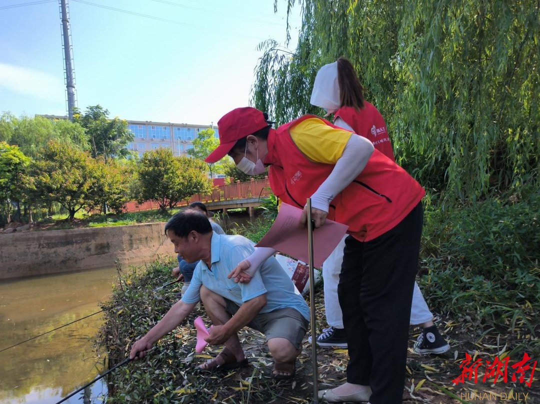 (7月20日,先锋街道“保护母亲河 文明垂钓”活动中,张菊珍顶着烈日分发文明倡议书,走到丛林深处拾起垃圾,守护环境。)