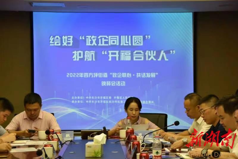 “这场晚餐会开得非常及时,正如刚才炎炎夏日的一场及时雨……”“这场活动让我们很有存在感,开福合伙人很温馨……” 7月28日晚,“绘好‘政企同心圆’·护航‘开福合伙人’”——长沙市开福区四方坪街道第二期“政企联心·共话发展”晚餐会在长沙国资集团举办,长沙市国有资产经营有限公司、长沙市万诚房地产开发有限公司、湖南海洋环球置业有限公司、湖南净亮、净高环境事业发展有限公司、湖南大内影视文化传媒有限公司、湖南宝中国际旅行社有限公司、长沙市金强环保科技有限公司、长沙银行四方支行等辖区9家重点企业、相关区直部门负责人及四方坪街道主要负责人和相关班子成员齐聚一堂,共叙政企情谊,共商发展大计。开福区人民政府副区长邹畅出席。
