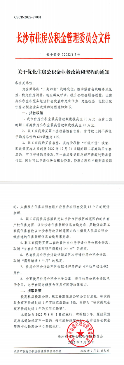 湖南日报·新湖南客户端7月22日讯(记者 王文)今日,长沙住房公积金管理委员会发布《关于优化住房公积金业务政策和流程的通知》明确,将住房公积金贷款最高贷款额度从60万元提高至70万元,生育三孩的家庭最高可贷80万元。