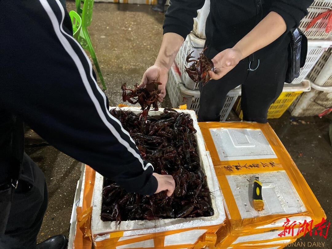 20日上午8时许,长沙县果园镇花果龙虾基地已是一派繁忙景象,一只只刚捕捞上来的小龙虾被过称测量,有的直接运往自家农庄,有的统一打包装车,当天便成为市民桌上的一道美味佳肴。