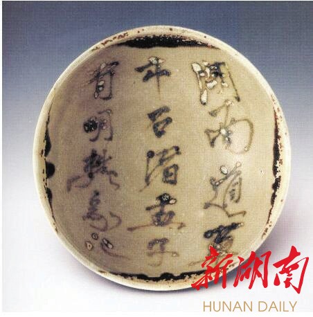 (长沙窑青釉褐绿彩题记碗,上书“湖南道草市石渚盂子有明樊家记”。 )