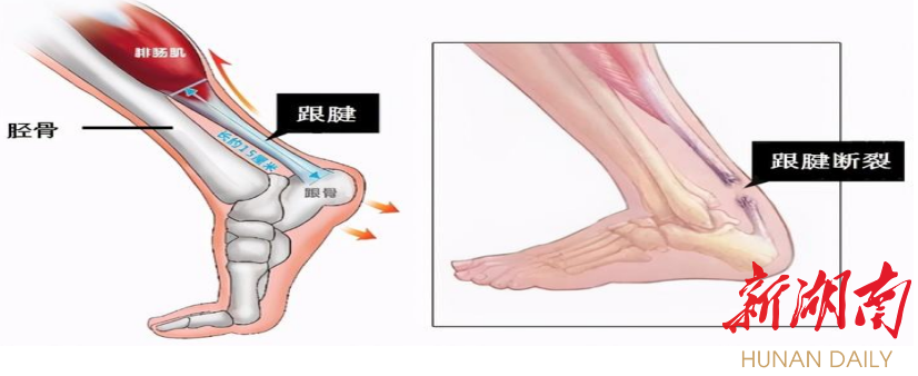 骨科二十三病室主任陈松介绍,跟腱是人体最粗大最强壮的肌腱,它的主要功能是传导小腿肌肉力量至足部,是支持人体直立、站稳,完成跑跳等动作的“主力”。在运动中,突然一个蹬地动作,尤其是猛烈跑、跳、滑步时,小腿三头肌猛烈收缩,使处于极度紧张状态下的跟腱受到过分牵拉,导致发生意外断裂,由其是当跟腱存在炎症、劳损、钙化等病变时,耐受力会明显减弱。跟腱一旦发生断裂,脚后跟会出现明显的疼痛、肿胀,无法完成单脚踮起脚尖、提起脚后跟的动作,不能正常行走;跟腱如果完全断裂,断端移位将会影响治疗效果。