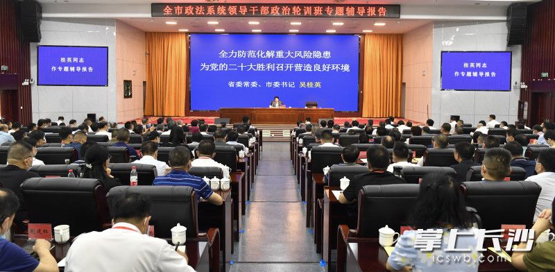 (7月1日上午,省委常委、长沙市委书记吴桂英为全市政法系统领导干部政治轮训班作专题辅导。均为长沙晚报全媒体记者 余劭劼 摄)