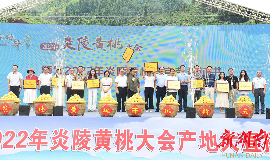 湖南日报7月25日讯(全媒体记者 张咪 通讯员 张和生 霍强)炎陵黄桃,桃醉天下。7月25日,2022年炎陵黄桃大会在炎陵县中村瑶族乡平乐村举行。当天,炎陵县农业农村局与湖南日报社旗下的“湘报严选”电商平台签订炎陵黄桃宣推营销合作协议,炎陵县部分公司、合作社与中国邮政、中石化、步步高、湖南绿叶水果等14家黄桃重点采购商签订采购协议,现场销售黄桃9750吨。