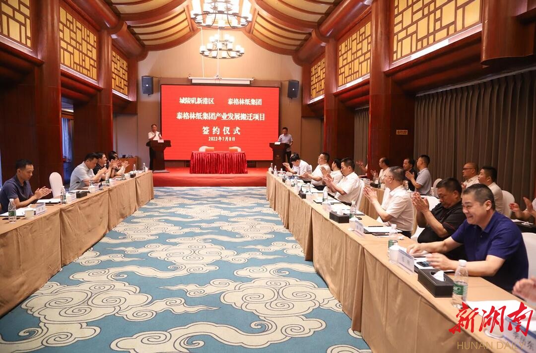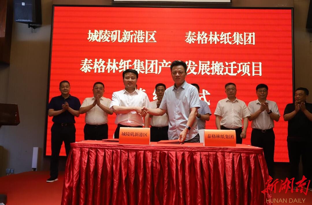 湖南日报·新湖南客户端7月9日讯(记者 徐典波 通讯员 刘克宏)7月8日,泰格林纸集团股份有限公司与城陵矶新港区共同签订泰格林纸集团产业发展搬迁项目协议。该项目总投资60亿元,其中固定资产投资约32亿元,达产后年产值约130亿元,5年内预计新增纳税3.7亿元。