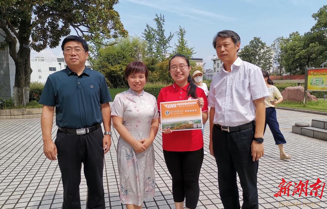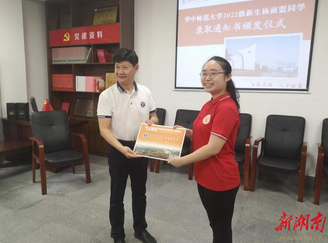 “录取通知书收到了,就可以穿上华中师范大学的校服了!”7月16日,华中师范大学党委书记赵凌云一行抵达岳阳市第一中学,郑重地将该校第一封录取通知书交到准大学生杨雨盟的手中。雨盟双手接过,笑开了花。