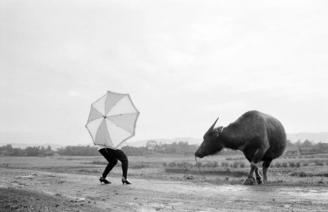 1990年,桃源县八字路乡南站村沅水大堤上,穿着高跟鞋、打着小雨伞的放牛女。