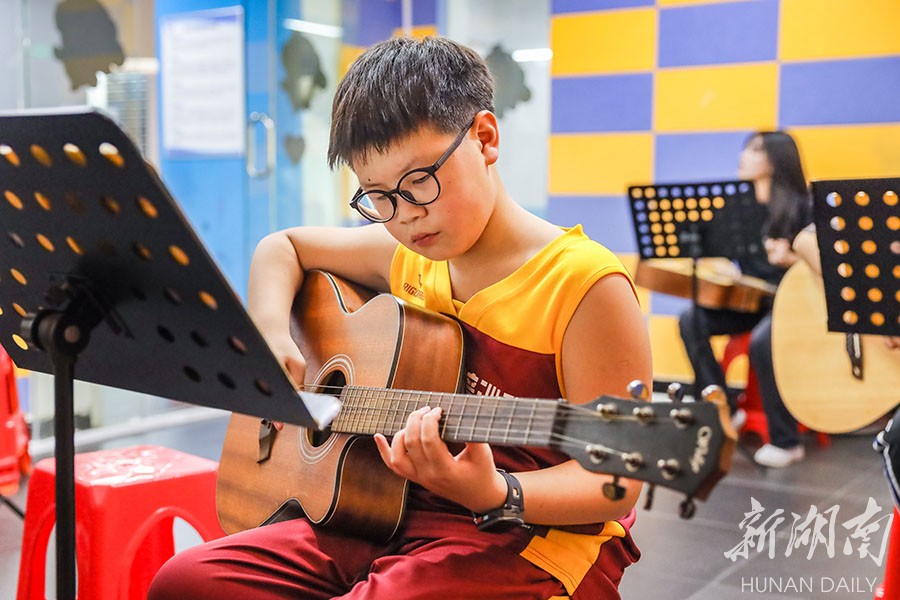 7月13日,蓝山县博艺乐器培训学校,学生在弹吉他。暑期期间,该县各大艺术培训中心和学校,孩子们纷纷投入到丰富多彩的学习活动中,通过学习美术、音乐、舞蹈等兴趣课程,感受艺术,增长知识,度过一个快乐而有意义的暑假。 彭华 摄