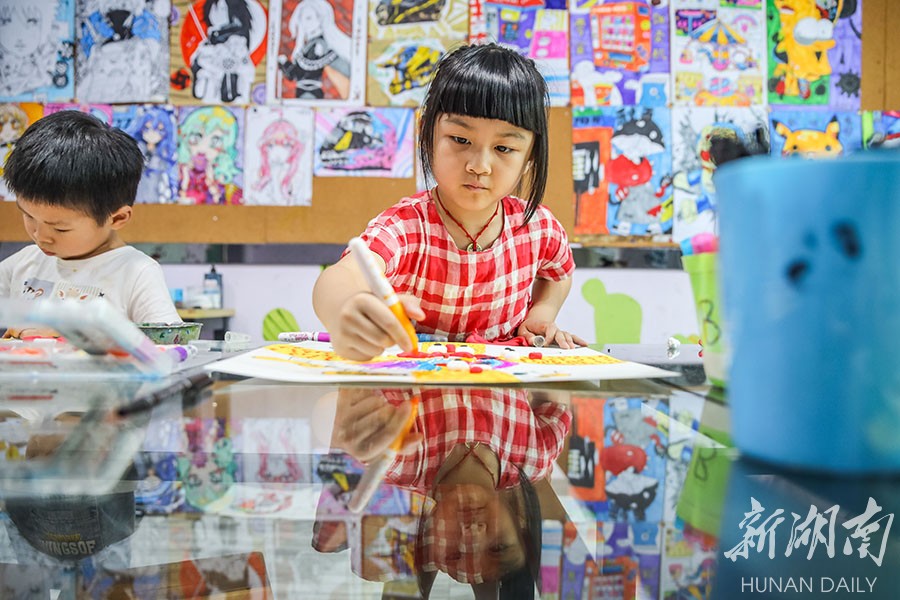 7月13日,蓝山县一石少儿美术培训学校,小朋友在做手工画。